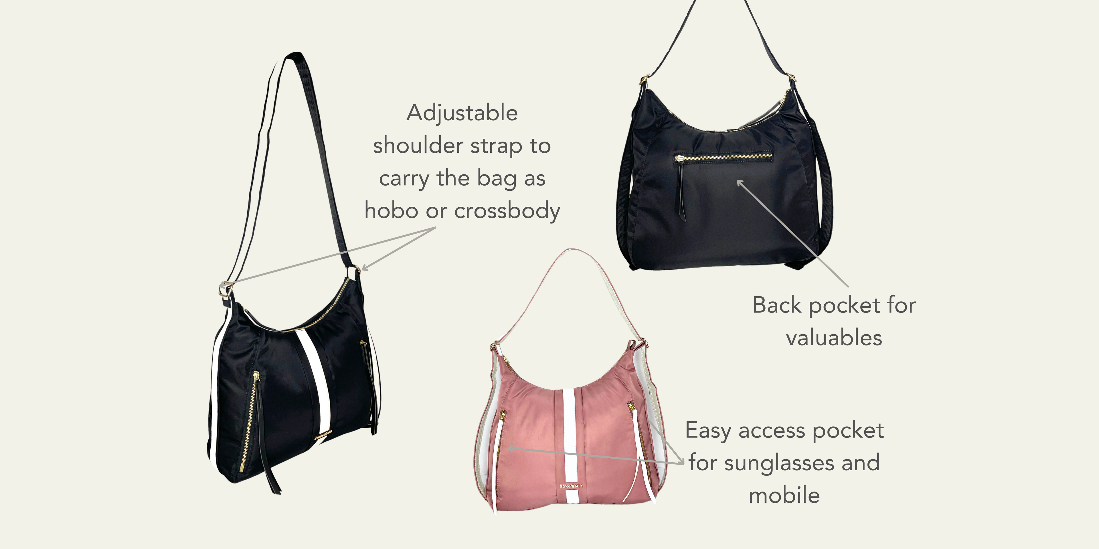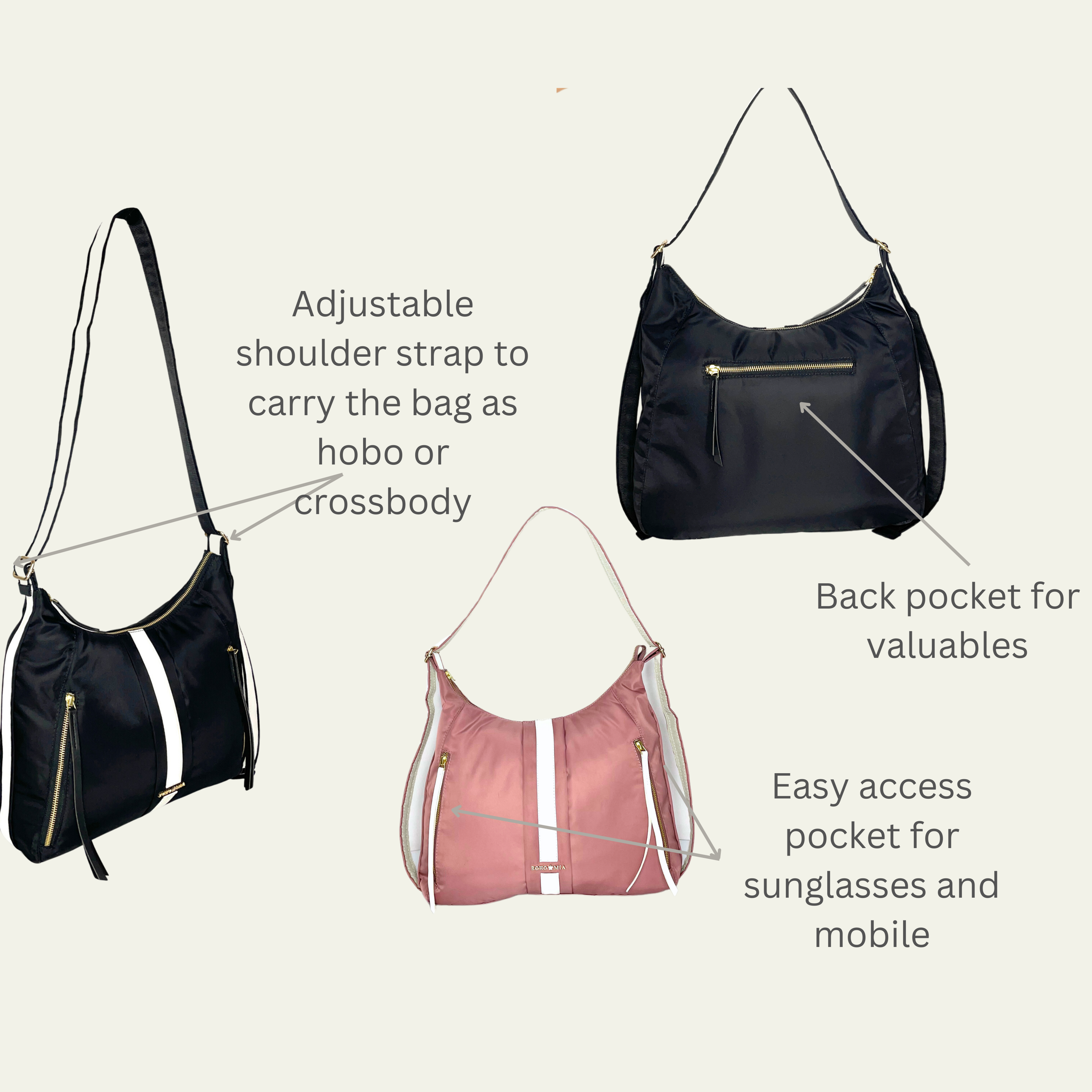 - Both side adjustable strap. Choose to carry it over your shoulder, like a regular hobo bag, or cross body (messenger style) for easy carrying