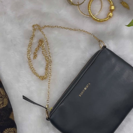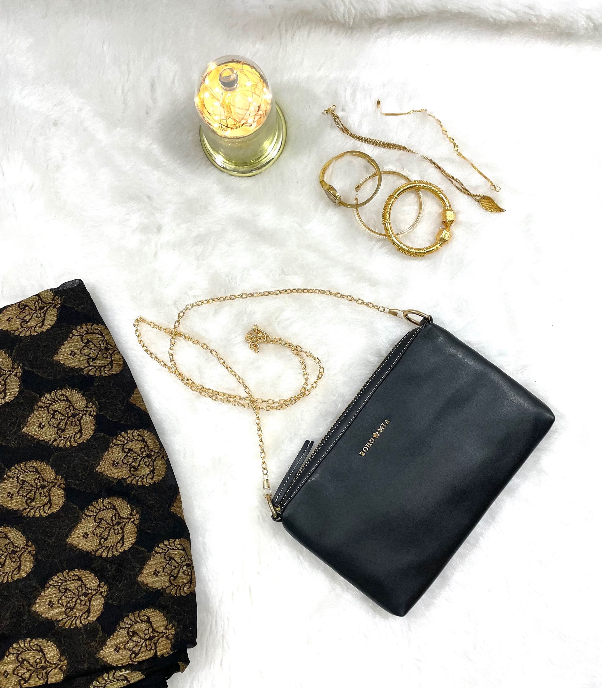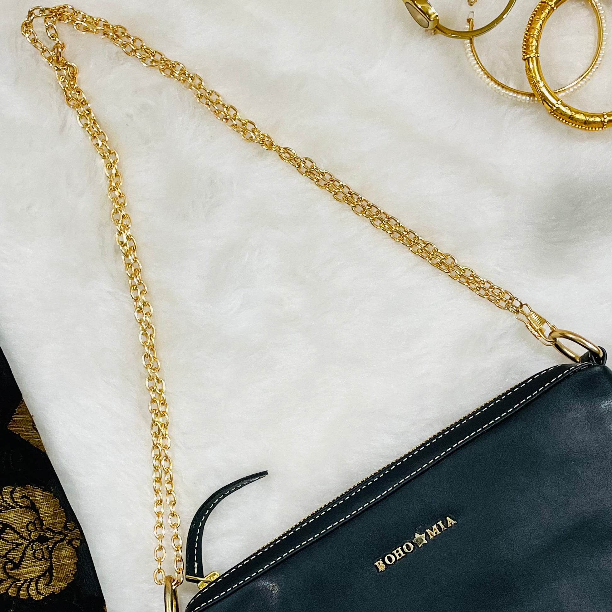 This festive season, add a glam quotient to your outfit while still using your favourite Bohomia bag. Replace our usual stap with this all gold metal strap. Use it long to carry our bags as a crossbody or double it up for party wear. This strap goes best with our Transfer clutch or BRB bags.