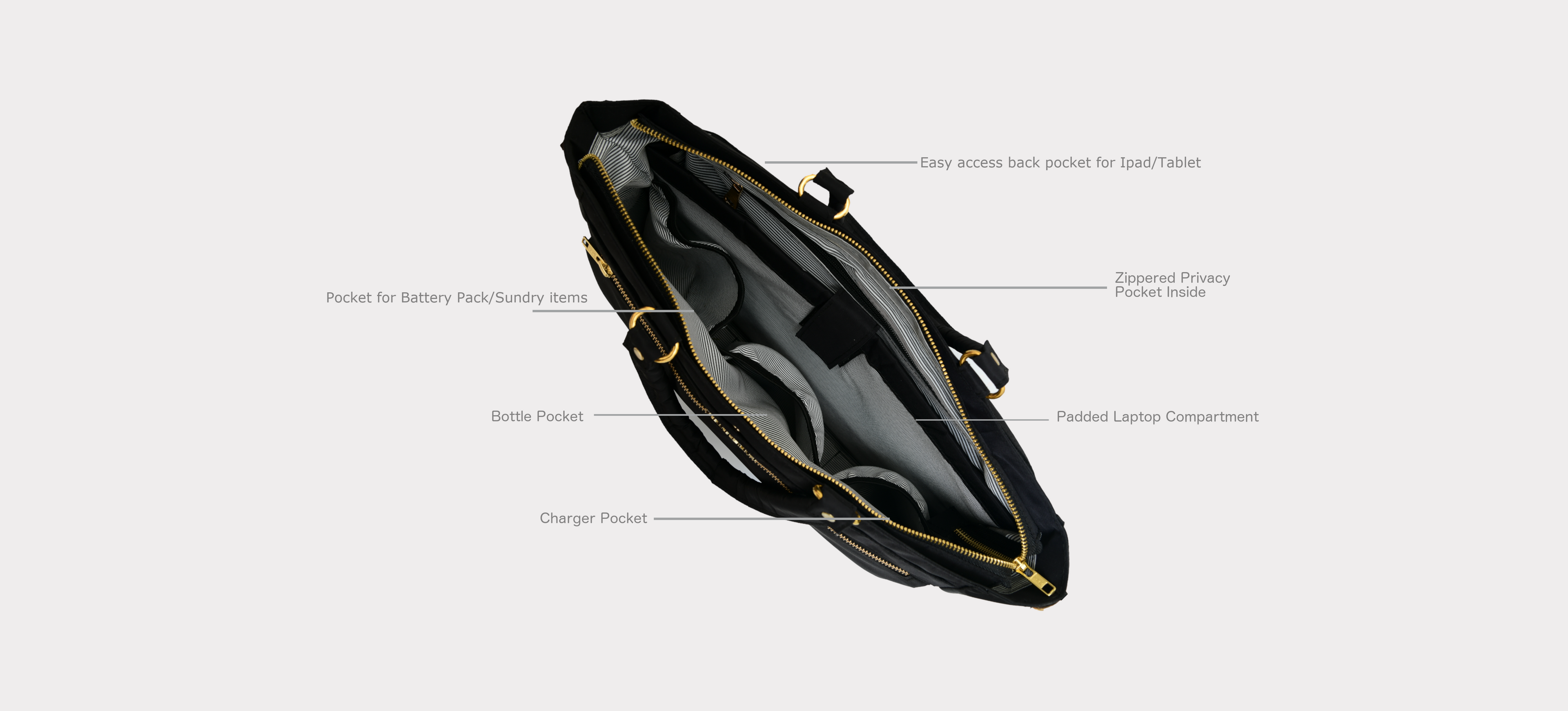 - Two outside zipper pockets and one main zipper compartment