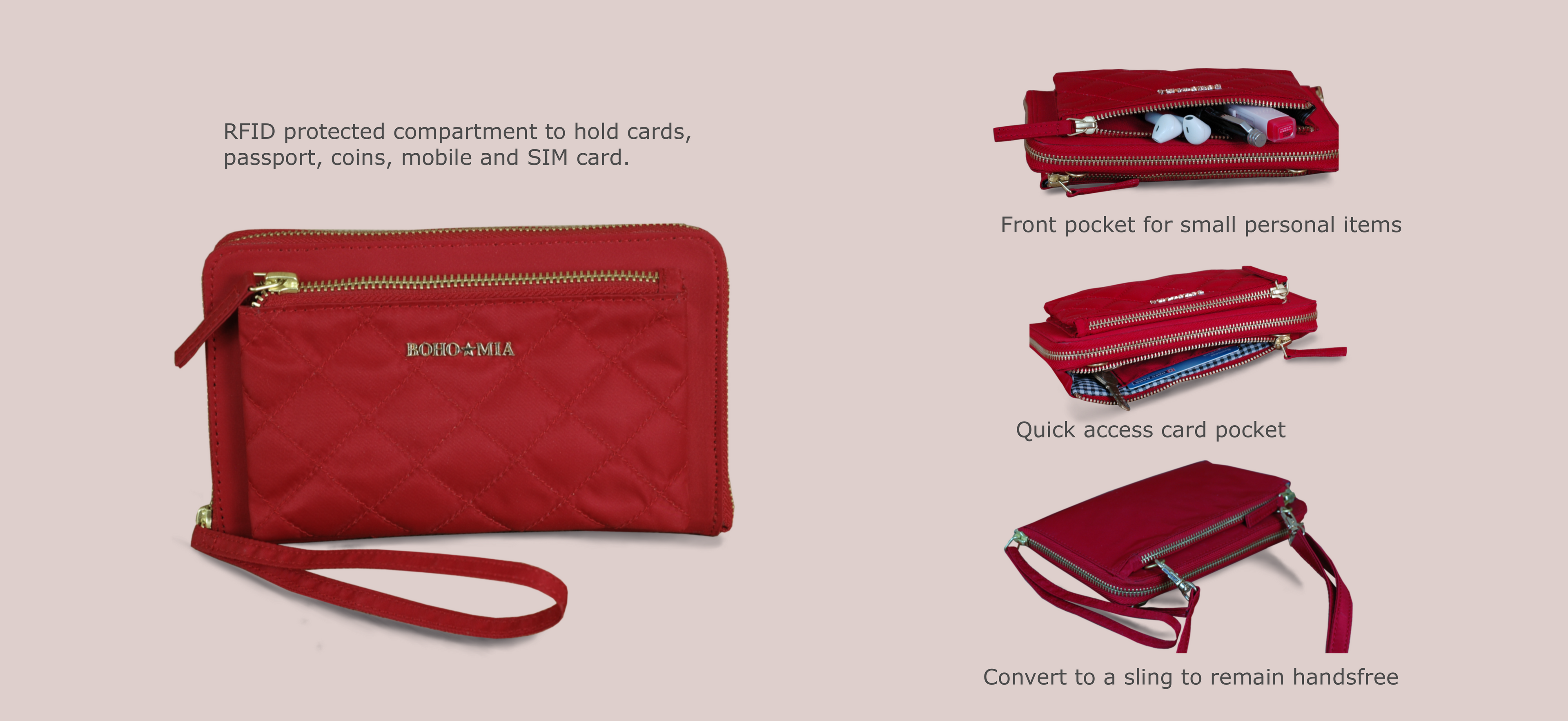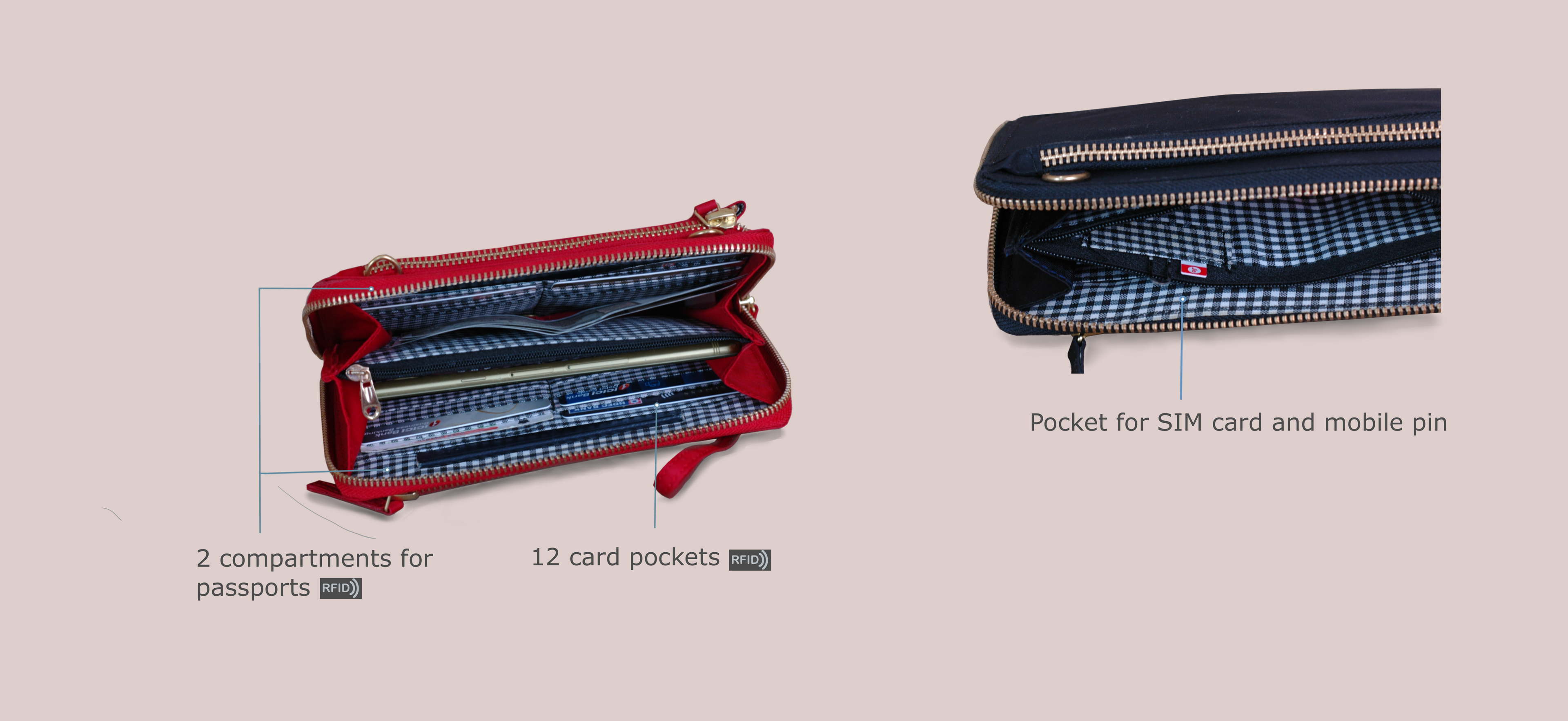 Now enjoy your trips even more with our Wanderer RFID Tavel Wallet. Our Wanderer Travel Wallet can organize your passport, cash, cards , sim cards, mobile, pen and even personal essentials all in one place in a secure RFID protected way. Not only is this wallet perfect for travel, it's also perfect for everyday use and stylish to the core! Easily grab and go with the Wanderer's handy wristlet wearable option or convert it to a sling and keep your hands free with the included shoulder strap.