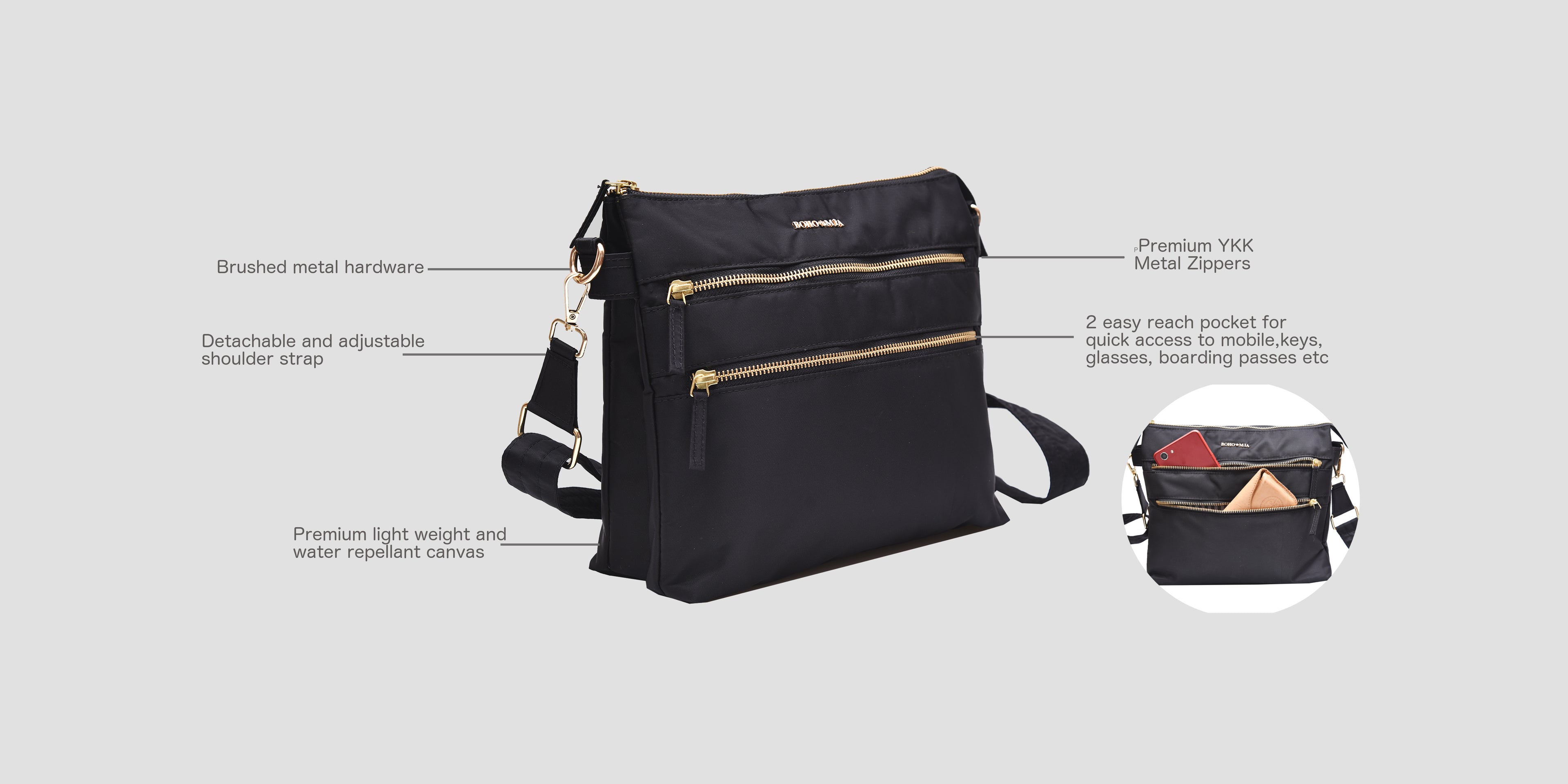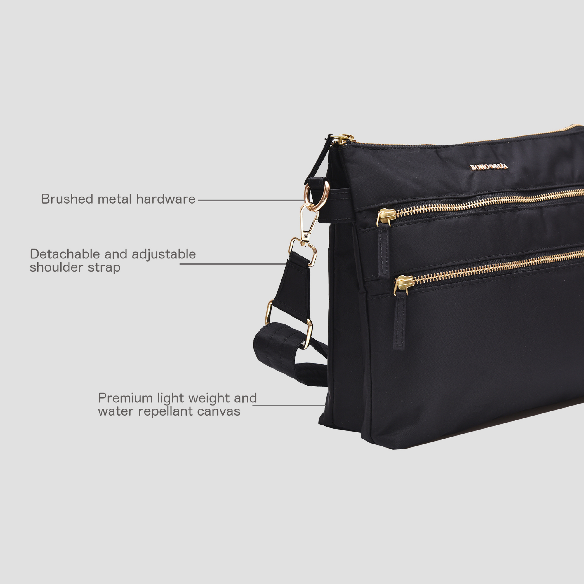 - Adjustable side strap to carry as a shoulder bag or crossbody bag.