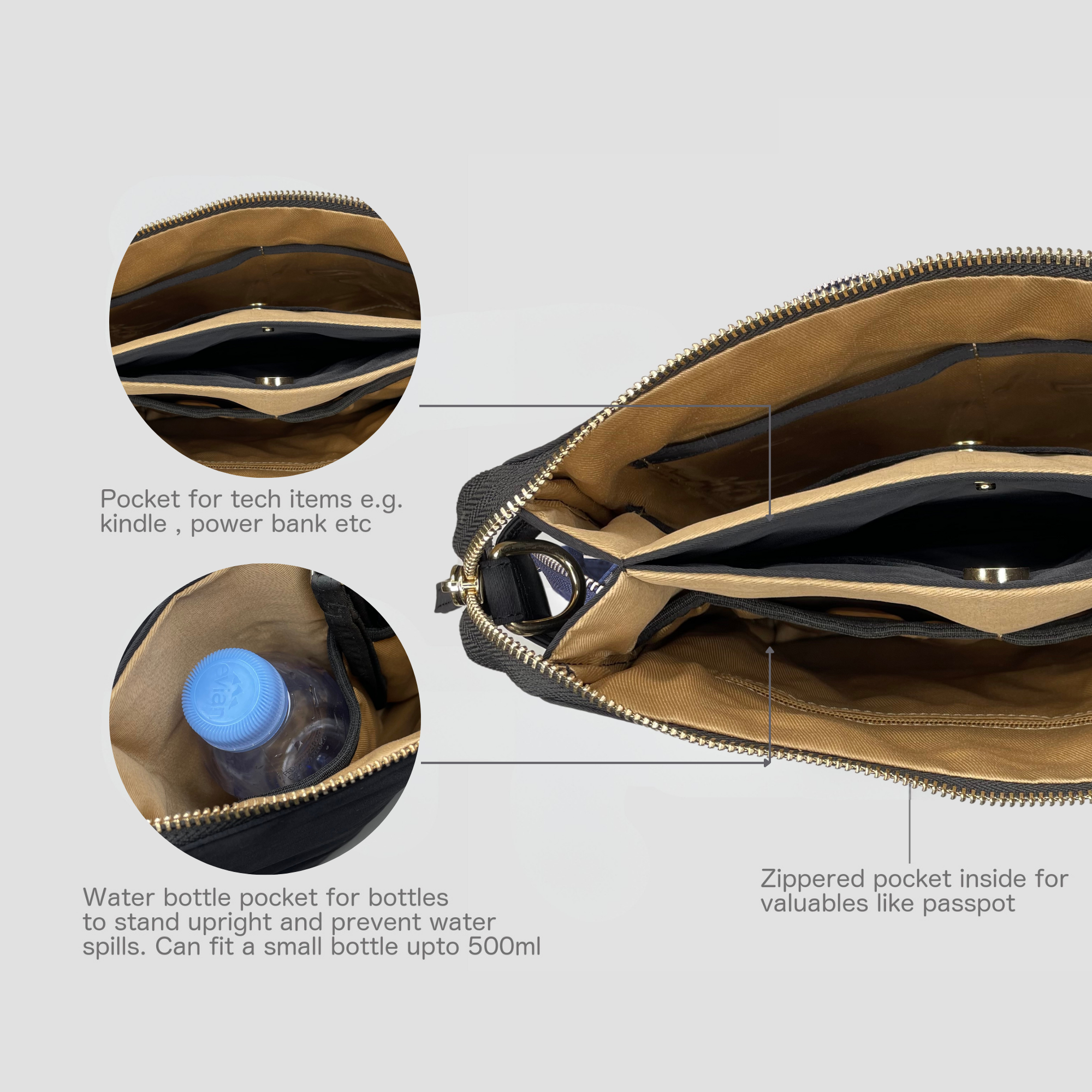 This crossbody bag is light and suitable for carrying your travel essentials. Can fit a small waterbottle , sunglasses, wallet, kindle, keys, mobile, charger, battery bank, pen, passport, a small notebook and makeup items. Use this as a travel sling or your everyday crossbody. Its great as both.
